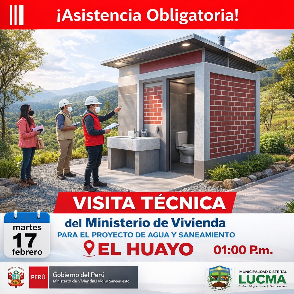 La Municipalidad Distrital de Lucma en coordinaciรณn con el ๐Œ๐ข๐ง๐ข๐ฌ๐ญ๐ž๐ซ๐ข๐จ ๐๐ž ๐•๐ข๐ฏ๐ข๐ž๐ง๐๐š ๐‚๐จ๐ง๐ฌ๐ญ๐ซ๐ฎ๐œ๐œ๐ข๐จฬ๐ง ๐ฒ ๐’๐š๐ง๐ž๐š๐ฆ๐ข๐ž๐ง๐ญ๐จ (๐Œ๐•๐‚๐’), convoca de manera ๐ฎ๐ซ๐ ๐ž๐ง๐ญ๐ž ๐ฒ ๐จ๐›๐ฅ๐ข๐ ๐š๐ญ๐จ๐ซ๐ข๐š a todos los beneficiarios del proyecto de agua y saneamiento del ๐‚๐š๐ฌ๐ž๐ซ๐ขฬ๐จ ๐ž๐ฅ ๐‡๐ฎ๐š๐ฒ๐จ a una reuniรณn extraordinaria, en la cual recibiremos la visita tรฉcnica del Ministerio de Vivienda.